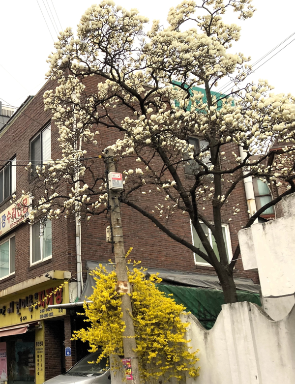 • 白い花が목련(モンニョン)=モクレン、黄色い花が개나리(ケナリ)=レンギョウ