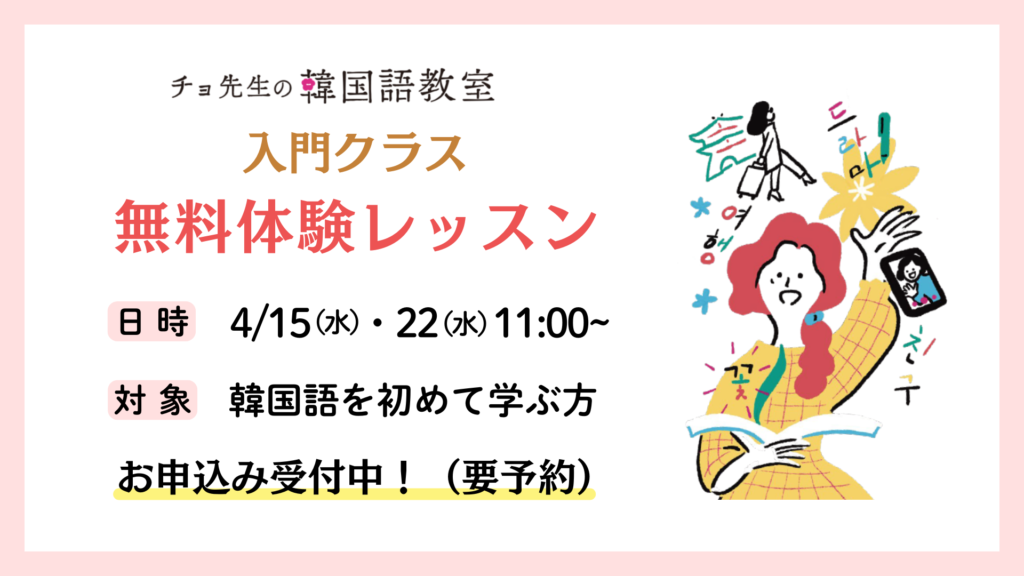 アンニョンハセヨ。東京・京王線「府中駅」徒歩7分のチョ先生の韓国語教室では、5月13日(水)に入門クラスを新規開講予定です。そこで、4月15日(水)、22日(水)に入門クラスの無料体験を開催します。